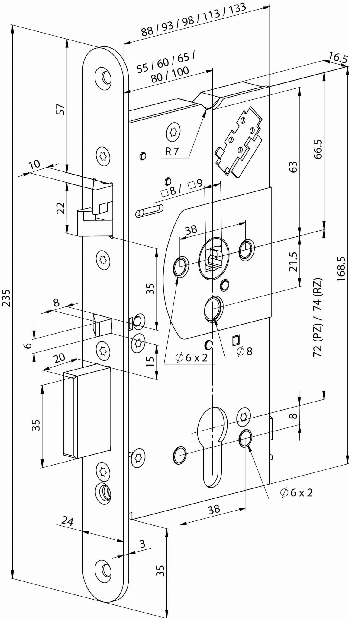 20mm rygiel prostokątny, 10mm zatrzask