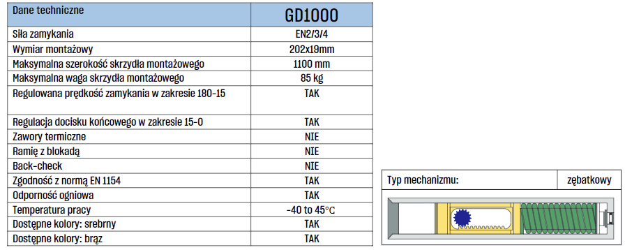 Samozamykacze serii Gerda GD1000 to najwyższej jakości urządzenia do samoczynnego zamykania drzwi wejściowych i wewnętrznych. Nowoczesna konstrukcja oraz zastosowanie najwyższej jakości materiałów zapewniają wieloletnią, bezawaryjną pracę prawidłowo zamontowanych samozamykaczy.