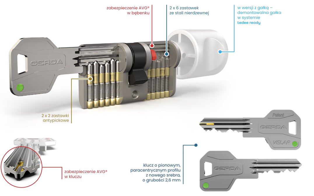 System klucza Master Key GERDA VELAR to innowacyjne rozwiązanie zabezpieczeń, które umożliwia obsługę wielu różnych zamków za pomocą jednego klucza. W ramach systemu dostępnych jest szereg produktów, które można zamontować w drzwiach, bramach, ogrodzeniach oraz różnego rodzaju szafkach. Należą do nich wkładki bębenkowe i cylindryczne, kłódki oraz camlocki.