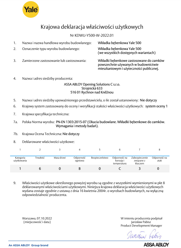 Wkładka Yale Seria 500 Standard Protection / System jednego klucza